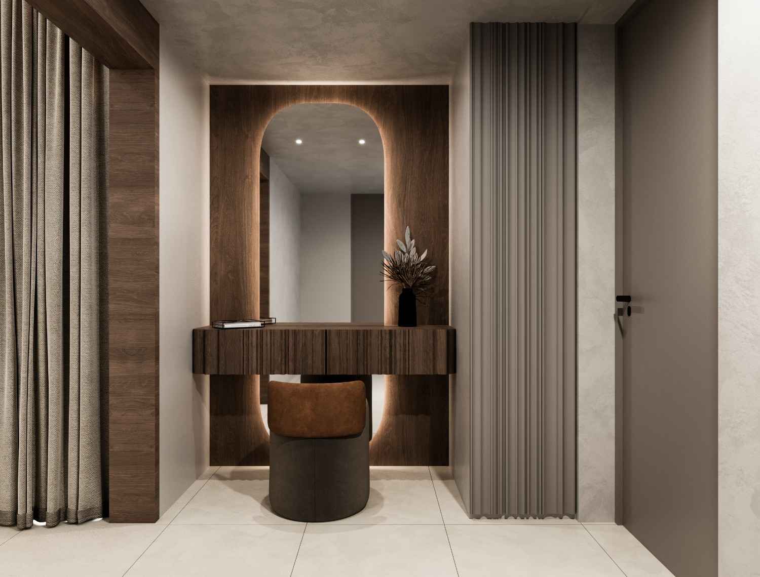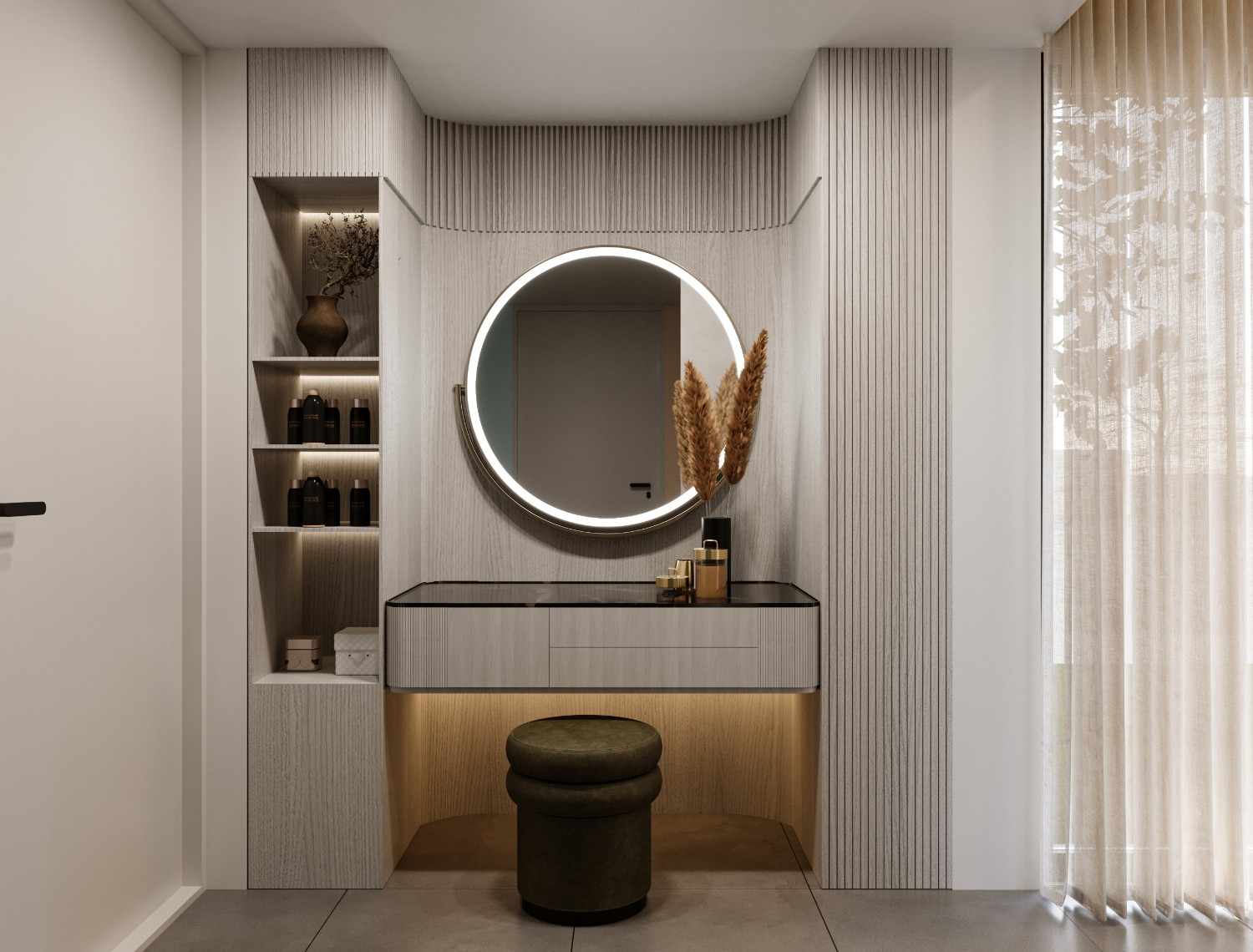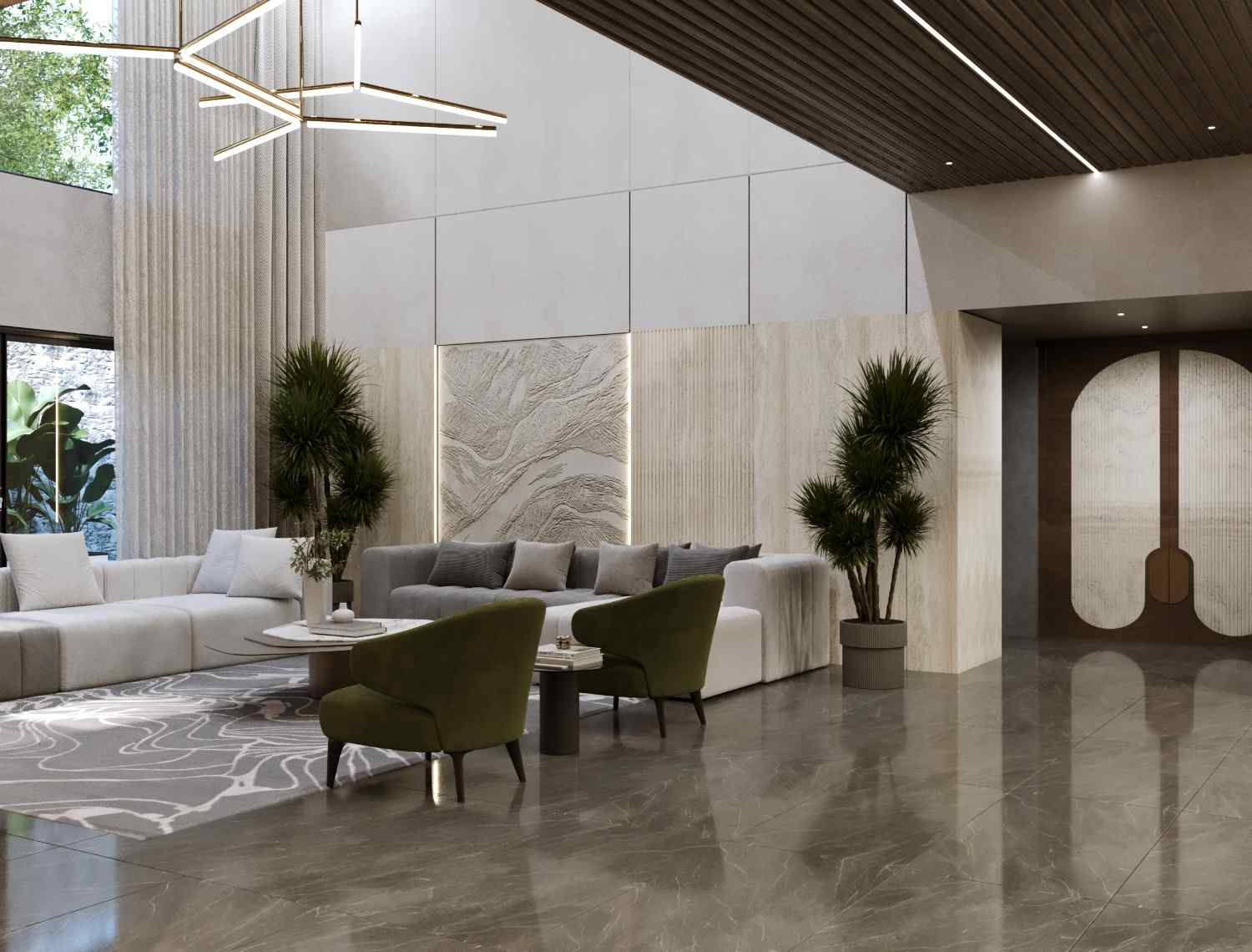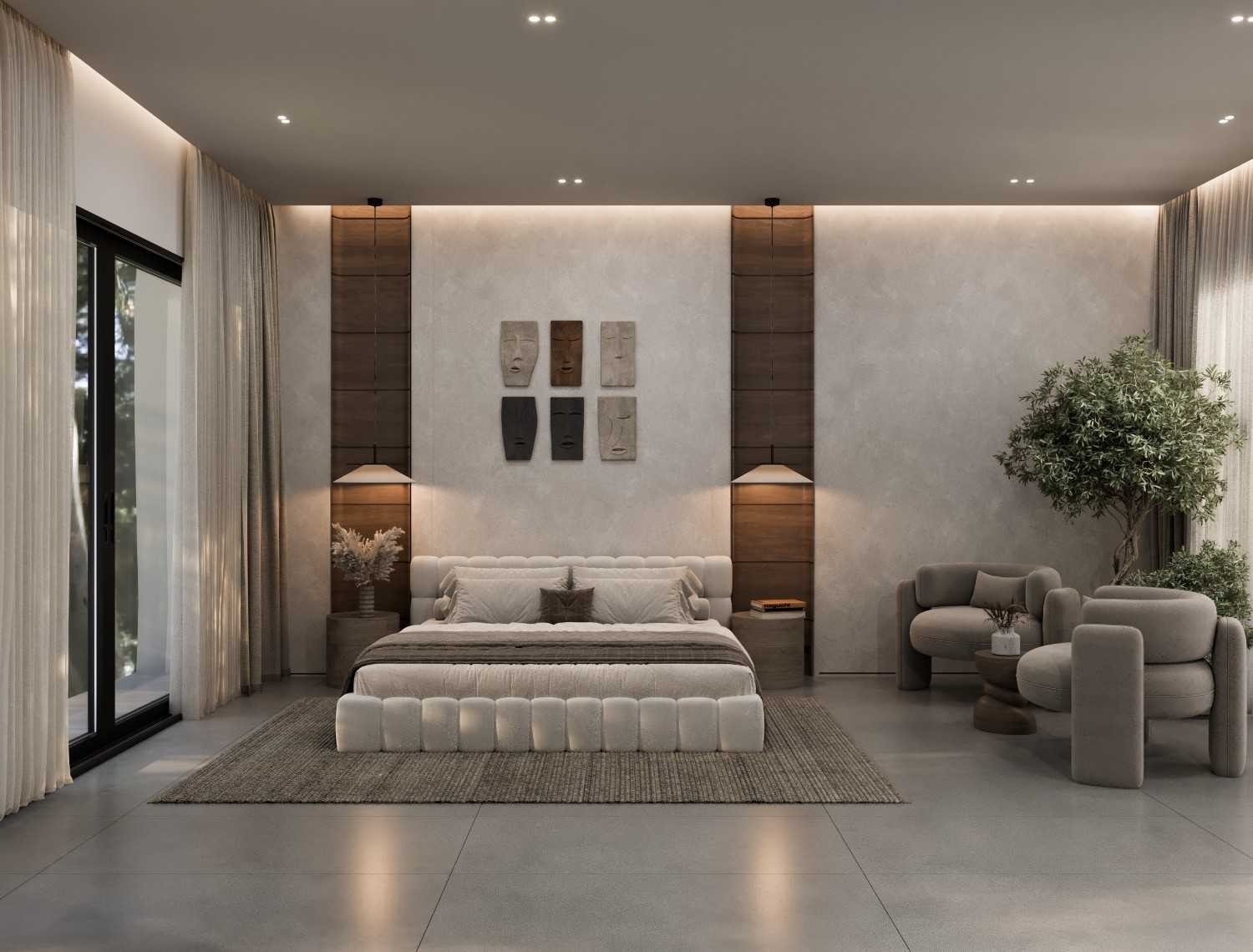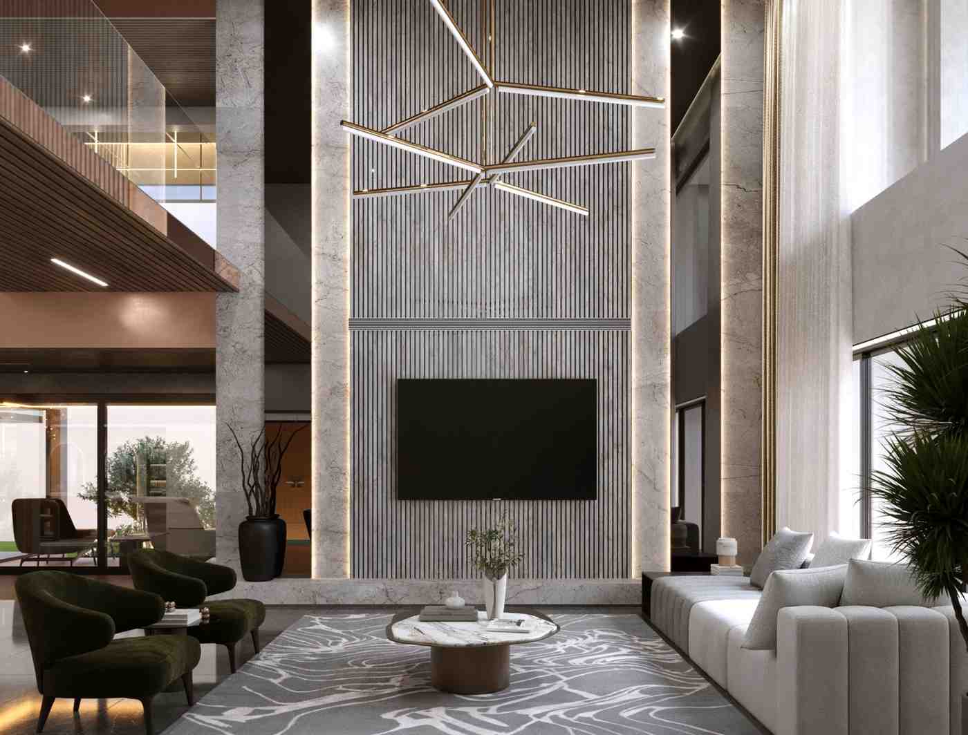 A refined modern interior defined by warm neutrals, natural textures, and clean architectural lines. Double-height spaces, sculptural lighting, and custom furniture create an atmosphere of understated elegance, while soft lighting and organic materials bring comfort and balance. The design blends functionality with timeless sophistication, resulting in calm, luxurious living spaces.