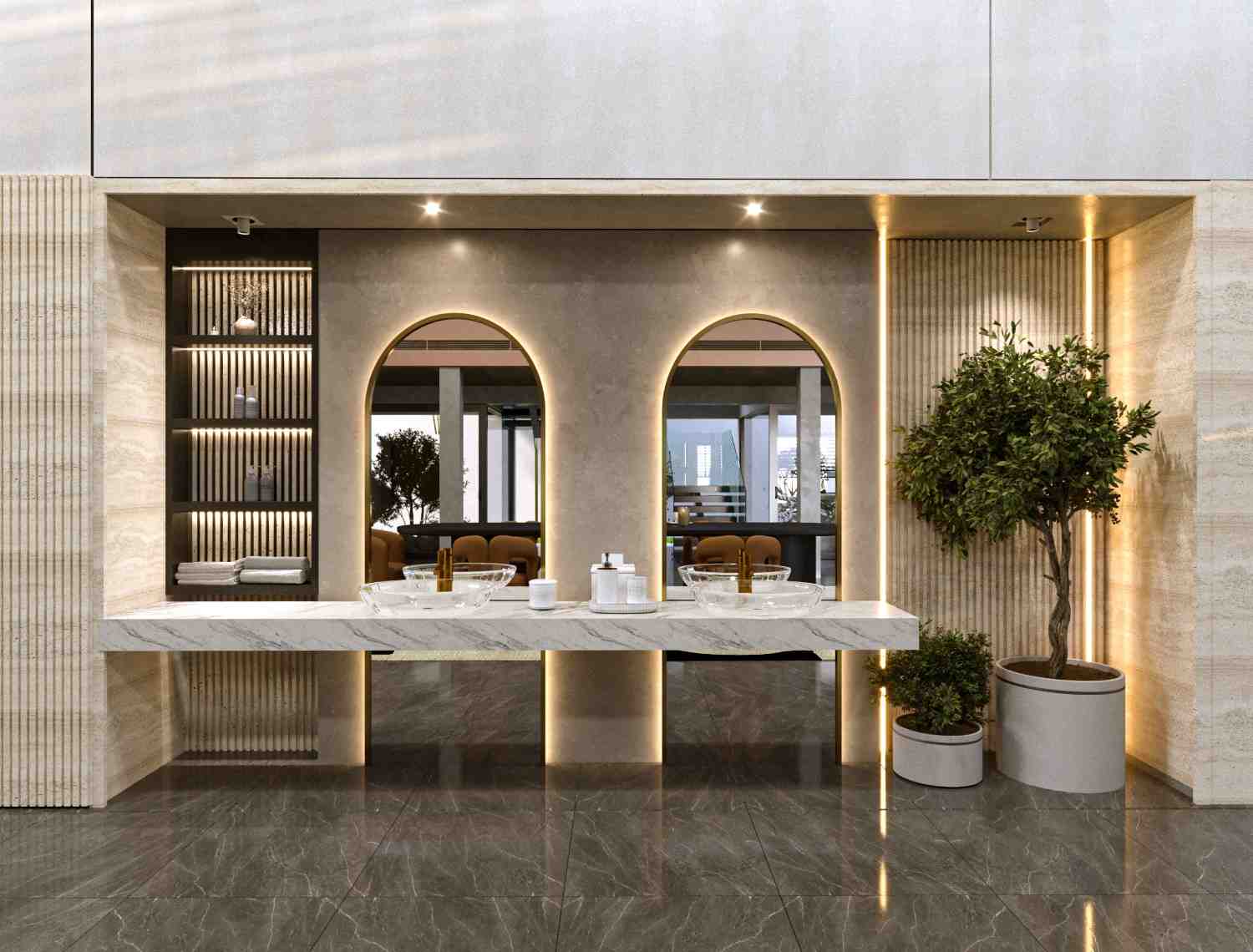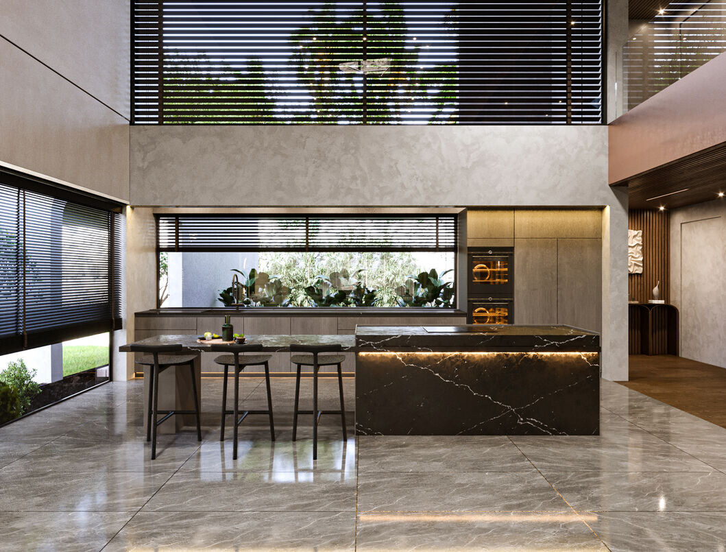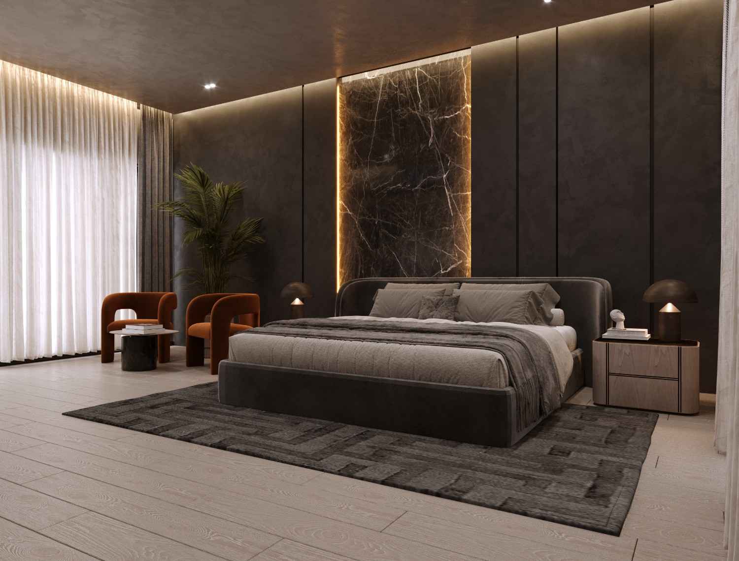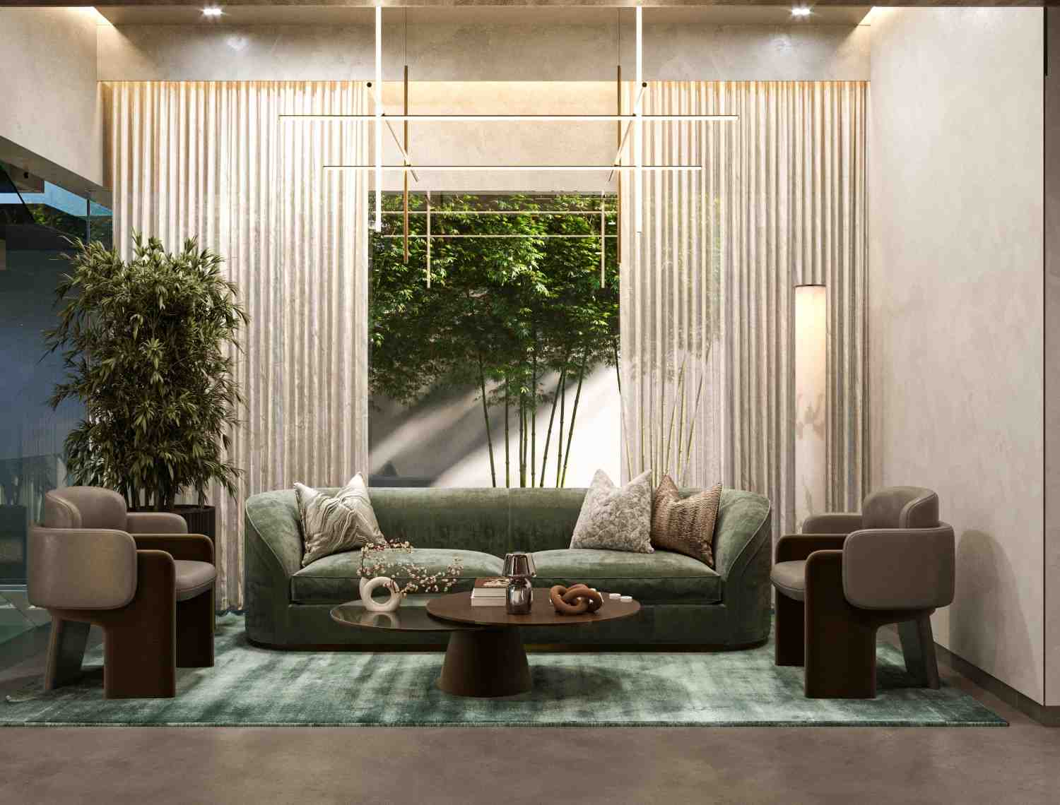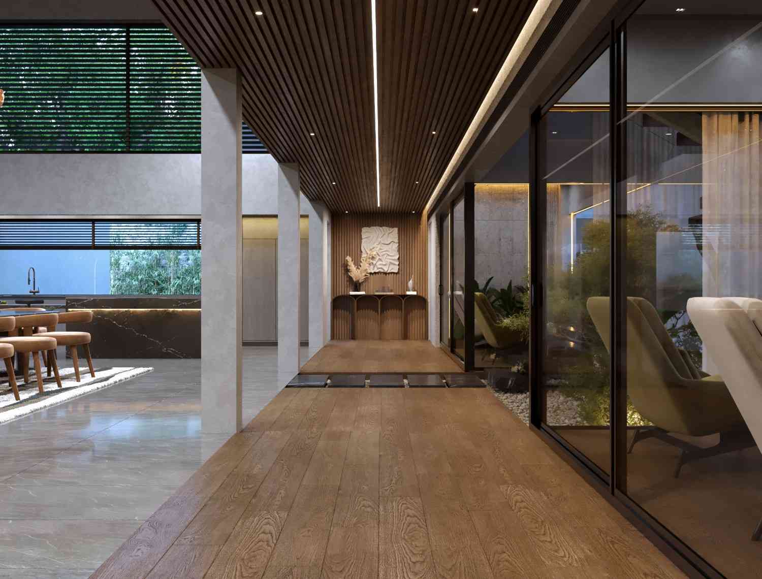 A refined modern interior defined by warm neutrals, natural textures, and clean architectural lines. Double-height spaces, sculptural lighting, and custom furniture create an atmosphere of understated elegance, while soft lighting and organic materials bring comfort and balance. The design blends functionality with timeless sophistication, resulting in calm, luxurious living spaces.
