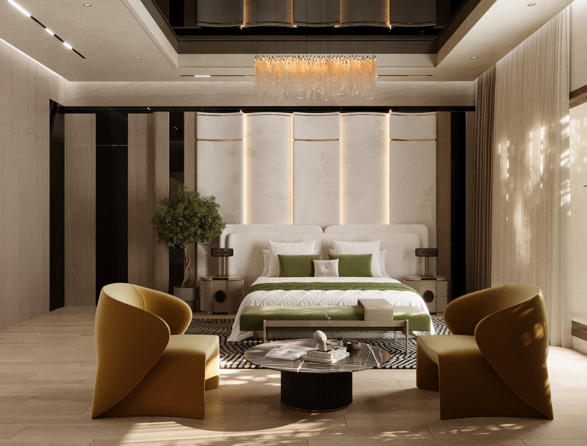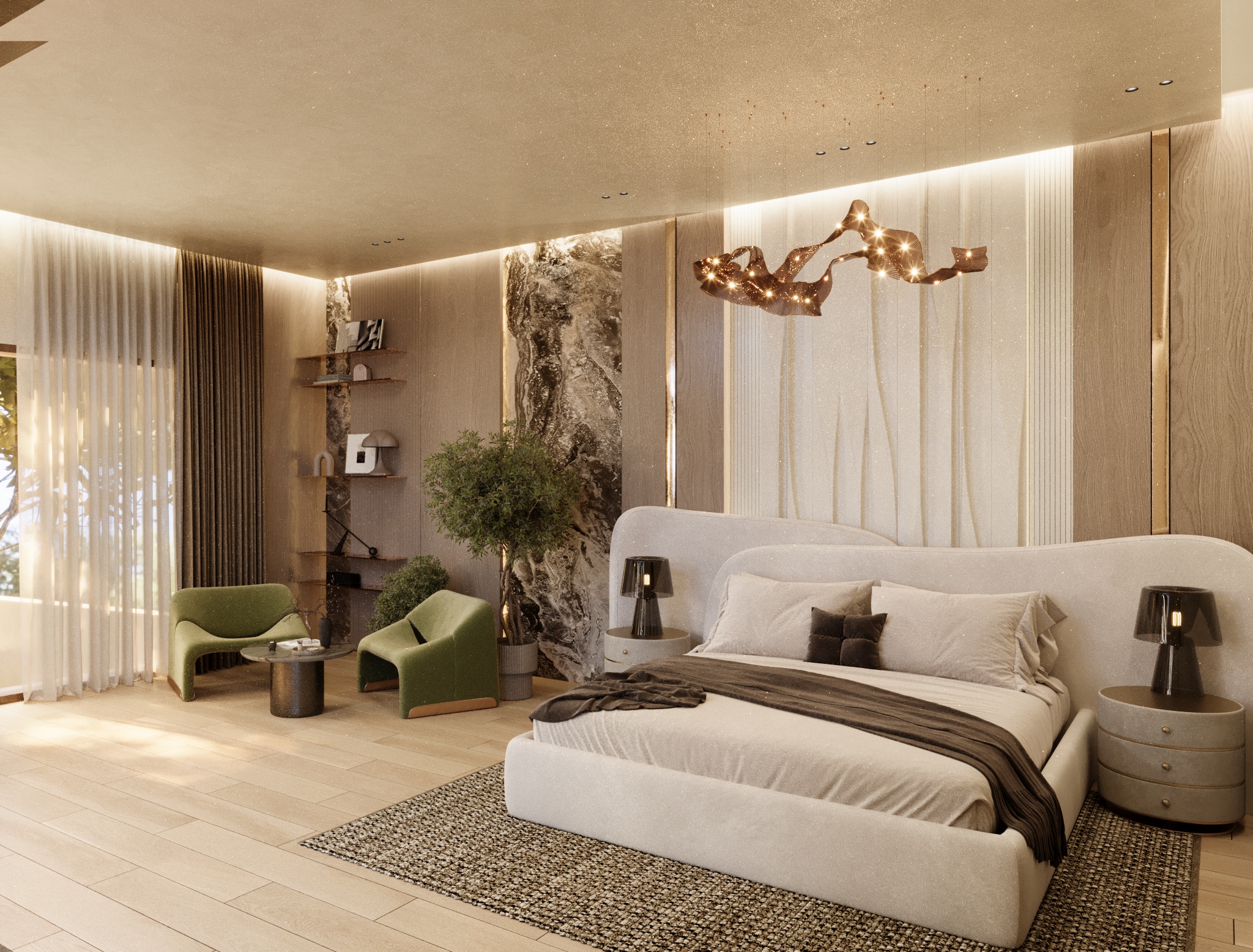 A contemporary master bedroom designed with a refined palette of warm neutrals and natural textures. The space balances comfort and elegance through clean lines, soft furnishings, and carefully curated materials. A statement feature wall adds visual depth, while layered lighting enhances the overall ambience. Large windows allow ample natural light, creating a calm and airy environment that connects the interior with the outdoors. Thoughtful detailing, minimal decor, and a cohesive material selection result in a serene and sophisticated bedroom tailored for everyday comfort and relaxation.