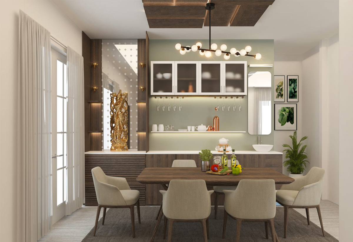 It is always great to have pops of colour in your home when you are living in a busy and crowded city like Hyderabad. When Nikhil approached us for the design he was specific about the importance of TV unit and Pooja area. So we focused on designing a TV unit that highlights the wall with the beautiful combination of white and Royal blue. He wanted his dining to be blessed with the grace of Pooja in the same space. The combination of sage green and white blends perfectly with the wooden finish giving it a graceful look.