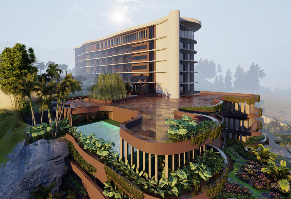 The five star Eco-hotel is a conceptual proposal in a remote hilly region near Calicut airport.