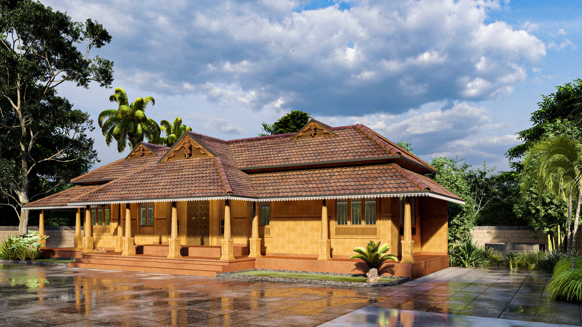 A residence located in Thrissur that embraces the Kerala traditional Nalukettu design. The residence is designed to display the raw finish with exposed brick. The landscaping and indoor courtyard with plants gives the home a lush and pleasant feel.