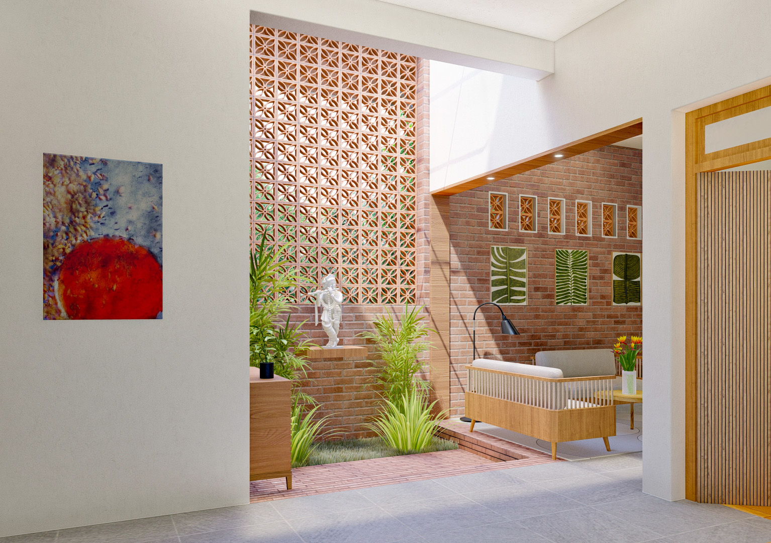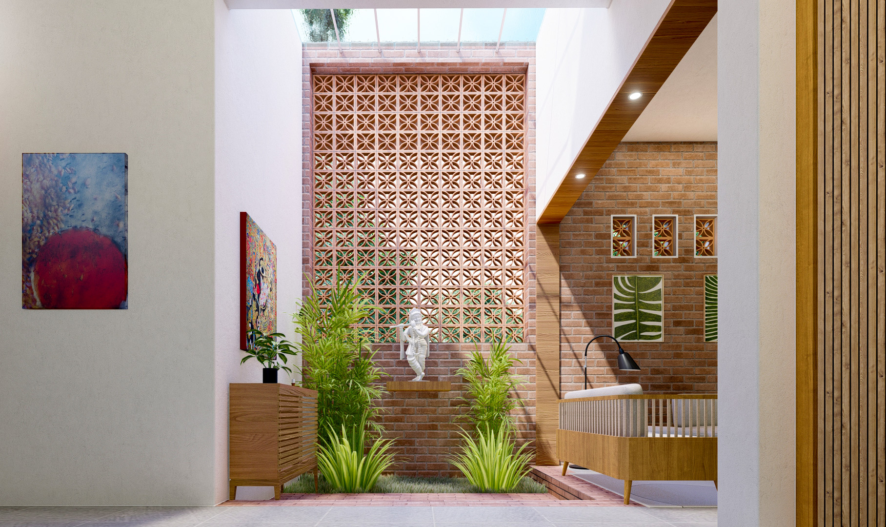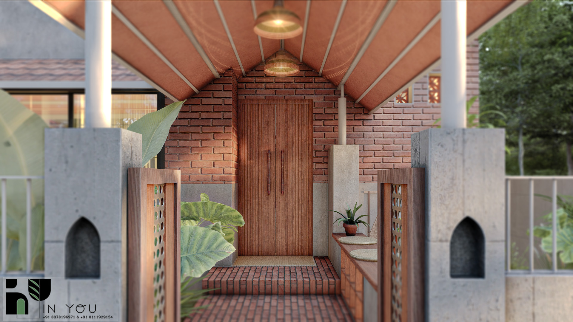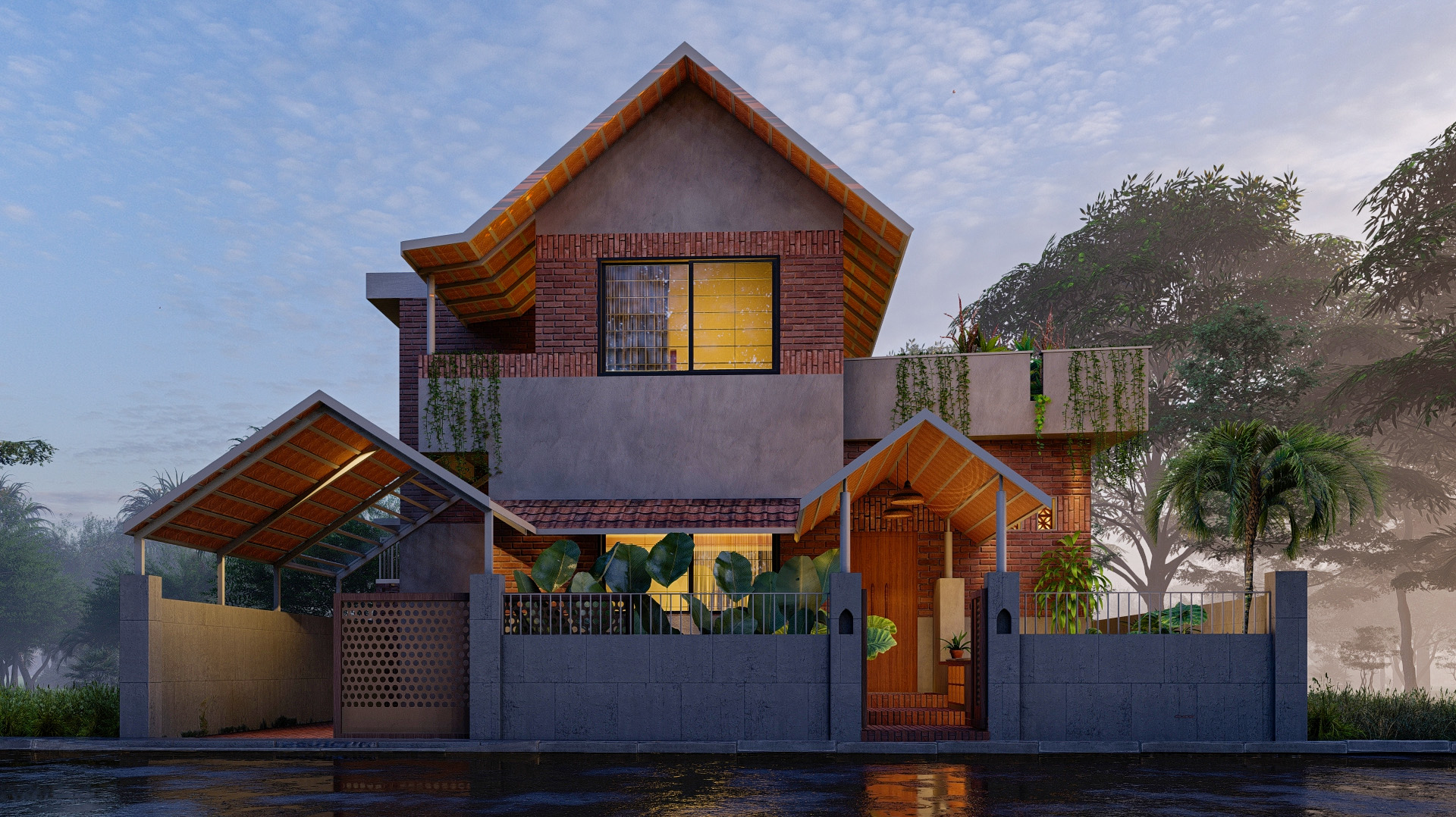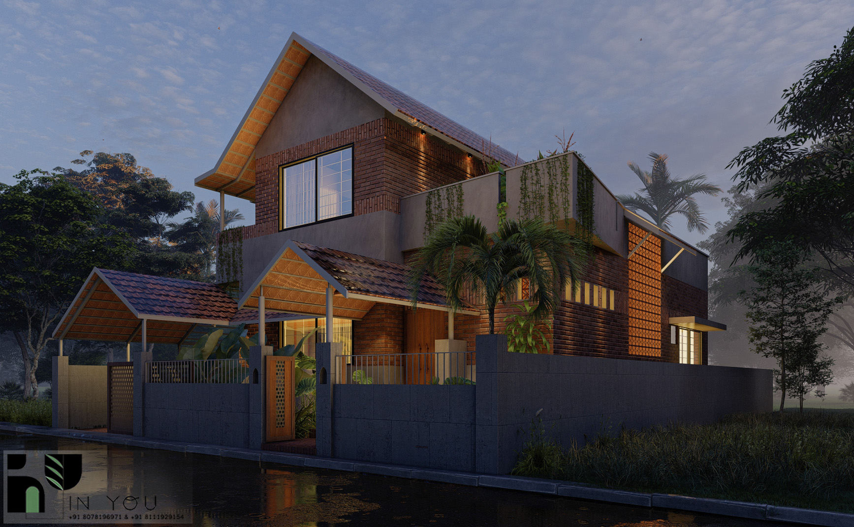The residence is situated in Thrissur. It is situated in a beautiful location surrounded with fields and landscapes. The residence is designed to compliment the environment with lot of openings and jallie walls that lets in natural light and ventilation. The walls of the residence is designed with exposed brick and cement texture to give it a raw finish and blend with the nature.